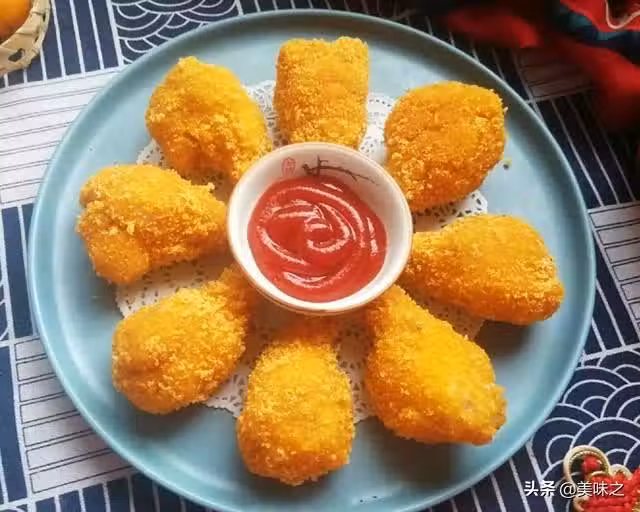 8、炸至金黃酥脆撈出,擺盤,蘸蕃茄醬食。