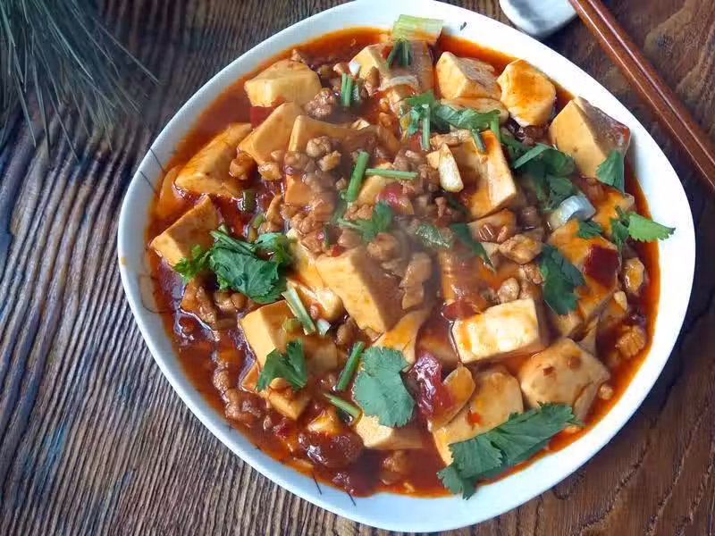【肉末豆腐】 食材:豆腐、豬肉、香菜、植物油、郫縣豆瓣醬、蔥、姜、蒜、料酒、生抽醬油、雞精、澱粉