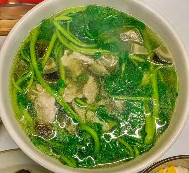 (4)再下入西洋菜煮軟,加入適量的食鹽和胡椒粉調味攪拌均勻。