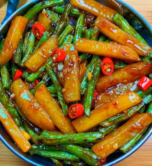 (4)放入蒜末和小米辣爆炒出香味,再下入土豆和豆角翻炒片刻。