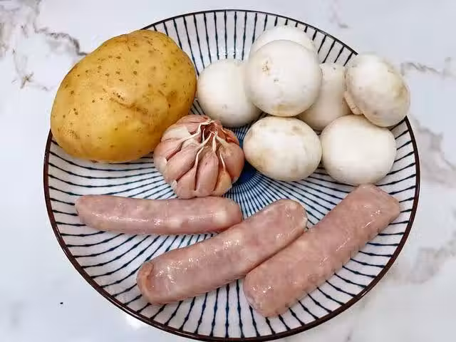 所需食材:口蘑,香腸,土豆,大蒜,黑胡椒碎,鹽,歐芹碎;