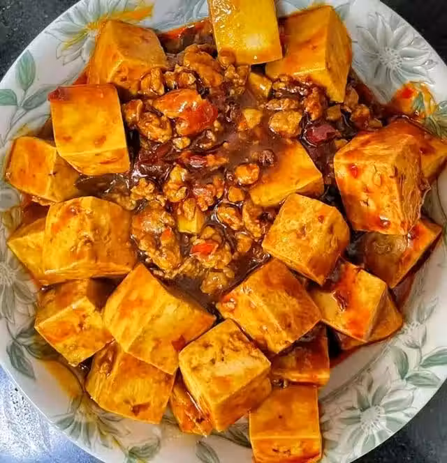 (1)嫩豆腐沖洗一下切塊,裡脊肉洗凈切末,干辣椒切段備用。