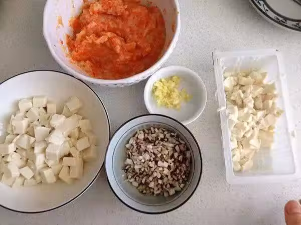 焯過的豆腐取一小部分(約1/3的豆腐)壓碎備用,香菇切末,姜切末備用。