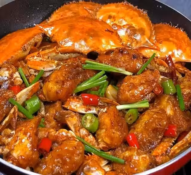 (2)切好的梭子蟹,均勻地裹上一層澱粉,下入油鍋中,炸至金黃色撈出備用。