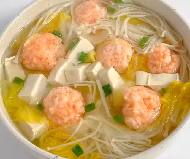 (2)鍋中倒入適量的清水煮沸,下入蝦丸子煮熟,再下入豆腐塊、白菜、金針菇。