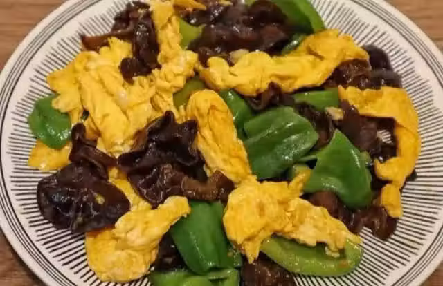 (1)木耳泡發,青椒切塊、雞蛋碗中打散、碗中倒油,油熱以後放雞蛋炒至定型盛出備用