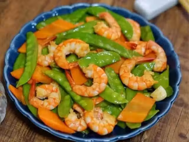 1、準備食材:蝦仁250克、荷蘭豆100克、胡蘿蔔、醬油、花生油、薑片、蒜末