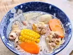 雞肉500g、玉米1根、胡蘿蔔1個、香菜、鹽少許。