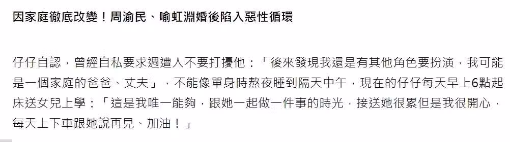 然而,周渝民工作時是演員,當他卸掉妝容進入生活時,他擔任著很多社會角色,他是別人的兒子,是喻虹淵的丈夫,是女兒的父親……人到中年,上有老下有小,千斤重擔一肩挑,不是一句「需要獨處」就能夠逃避。