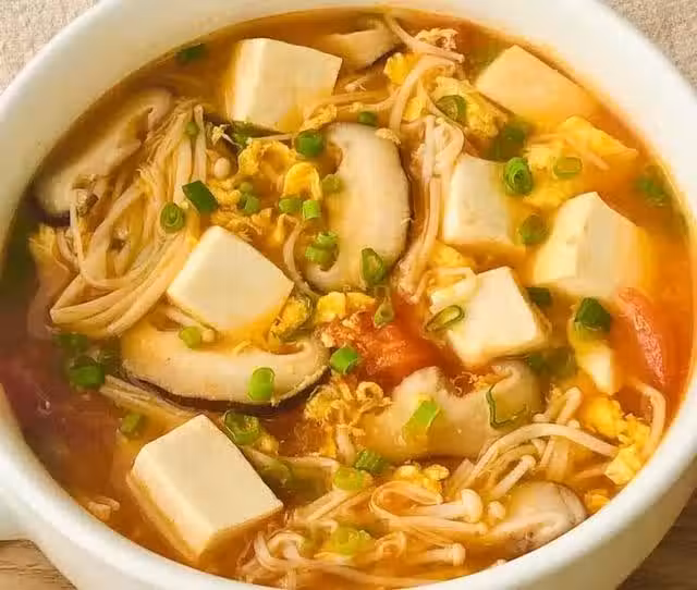 (1)番茄洗凈切塊、金針菇去根部,用鹼面洗凈撕開,嫩豆腐沖洗一下切塊,小蔥去皮沖洗一下切圈,蒜瓣剝皮切末備用。