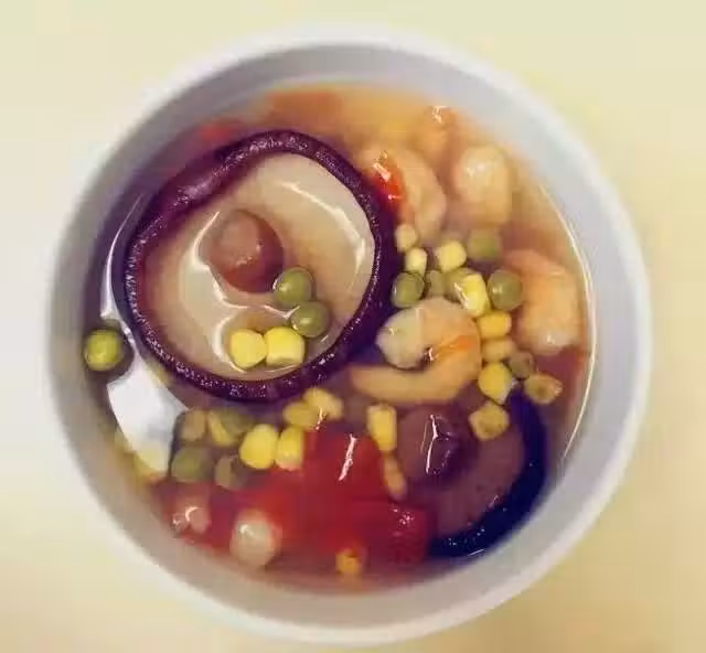 蝦肉、干香菇、西紅柿、玉米豌豆類