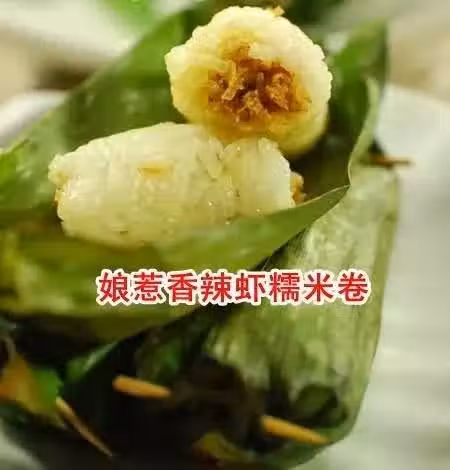 7、將1湯匙糯米飯鋪在香蕉葉上,用湯匙壓平,再加2茶匙蝦米餡料,捲起,兩頭串緊包好,用牙籤固定(嫌麻煩的可直接用釘書機釘牢)。