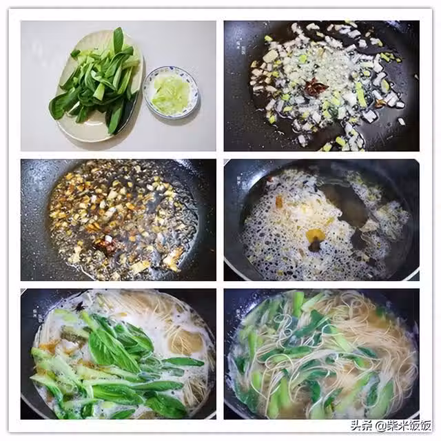 5,接著下入麵條,再放入青菜,大火將面煮熟。