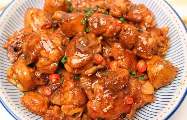 (3)鍋中倒入適量的油,油熱下入雞腿翻炒片刻,倒入腌制雞腿剩下的料汁。