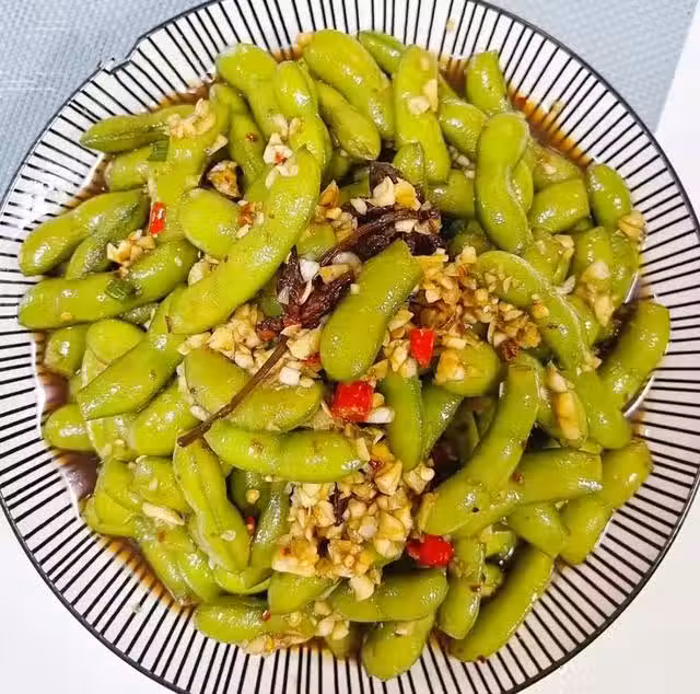 (5)再倒入調好的料汁攪拌均勻,等待半個小時毛豆入味以後再吃,做法簡單,開胃又下飯,大人小孩都喜歡吃的一道涼拌菜!