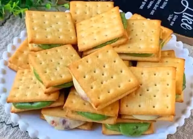 (3)取一片蘇打餅乾挖一勺餡料,在鋪上一層蘇打餅乾壓緊實即可,外酥里糯特別好吃大人小孩都愛吃!
