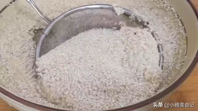 2.將控水之後的芝麻倒入鍋中,炒一下芝麻表皮的水分炒的時候用鏟子不停的翻拌。一直炒到鍋中有噼里啪啦的響聲就可以了,炒好後盛入盤中放涼備用。