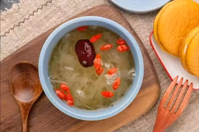 5、攪拌到出膠以後,把紅棗、百合加進去,接著蓋上蓋子,繼續燉上20分鐘。到時間了之後,將枸杞放進去,再把冰糖倒在裡面,不喜歡吃甜的話,可以少放一點,放2、3粒就可以了,用勺子攪拌一下,把冰糖攪拌到融化,舀出來盛在碗里開吃!
