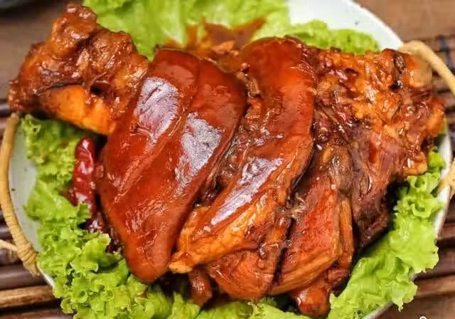 (8)盤底鋪一層生菜,上面放入肘子即可開吃了,色香味俱全,好吃又下飯,做法簡單,廚房小白也能輕鬆駕馭,老少皆宜。