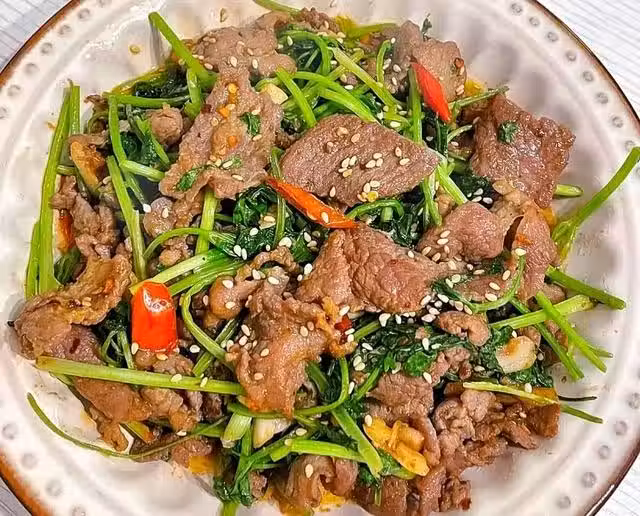 (2)鍋中倒入適量的油,油熱爆香小米辣和蒜末,再下入牛肉翻炒片刻。