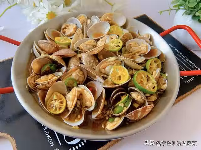 3.做好的碗汁倒入花甲中,放青檸片拌勻撒上香蔥,腌30分鐘即可。