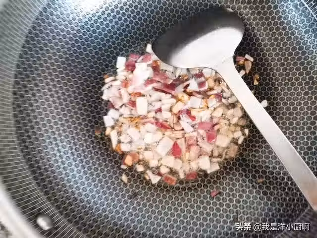 步驟五:再將炸好的洋蔥盛出來,或者直接推到鍋邊,將生薑和香蔥倒入鍋中炒香,接著將切好的肉塊入鍋翻炒。