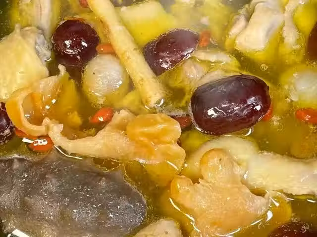 食材準備:花膠、海參、雞肉、黨參、黃芪、桂圓、麥冬、紅棗、枸杞子、薑片、蔥段。