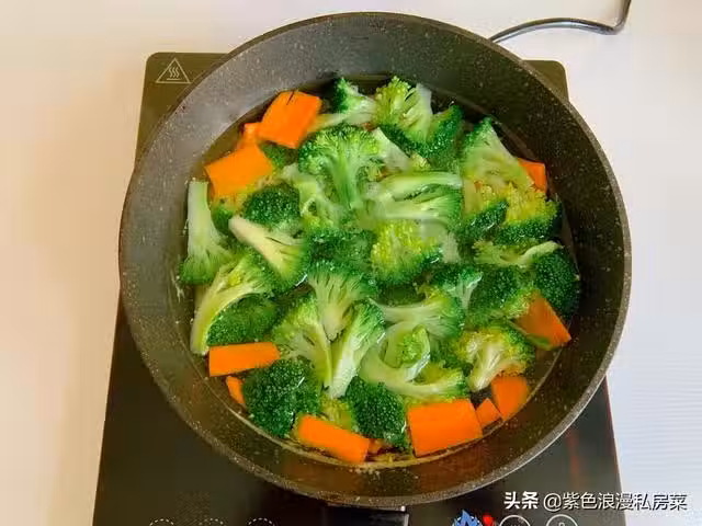 5.放西藍花和胡蘿蔔翻炒。