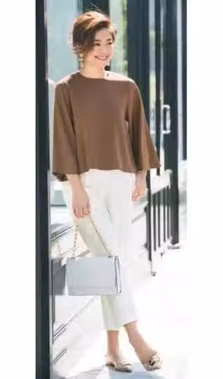 圓領樣式的棕色喇叭袖襯衫,對於膚色白皙的博主來說,將她的臉型刻畫得更加圓潤飽滿,氣色也很紅潤,上衣的喇叭袖也和寬鬆的一百之間形成了呼應,配上一款高收腰的白色九分小腳褲,幹練又優雅。