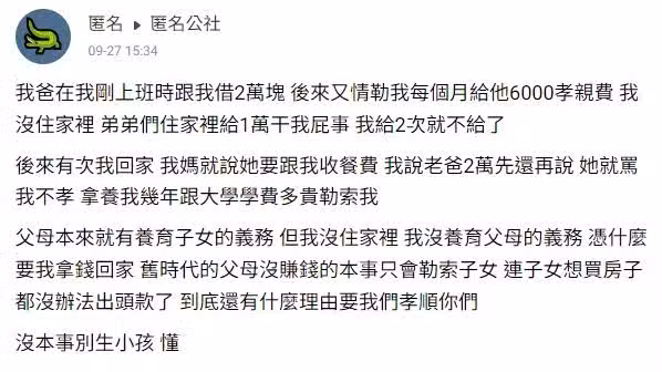 對此,原po相當不滿自己被情緒勒索,直言開嗆「我沒養育父母的義務,連子女想買房子都沒辦法出頭款了,到底還有什麼理由要我們孝順你們?沒本事別生小孩,懂?」看完原po的敘述,網友紛紛留言「所以我不生小孩,生出這種廢物,錢我不如自己花」、「笑死,大學學費父母出,還想買房頭款讓父母出啊」、「要出頭期款才能孝順,大開眼界了」、「沒讓你背學貸就要感恩了,真的要清算18歲後跟家裡拿的通通吐出來」、「不孝順父母,還敢出來抱怨真是厚顏無恥」。