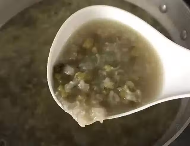 3、10分鐘後,綠豆開花了,轉小火,繼續煮20分鐘,綠豆粥就煮好了。
