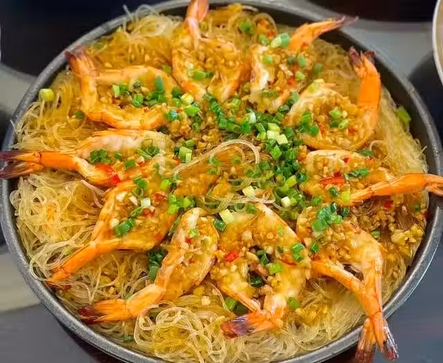 (3)盤中放入泡軟的粉絲,上面均勻地擺放上大蝦,再淋上一碗調好的料汁。