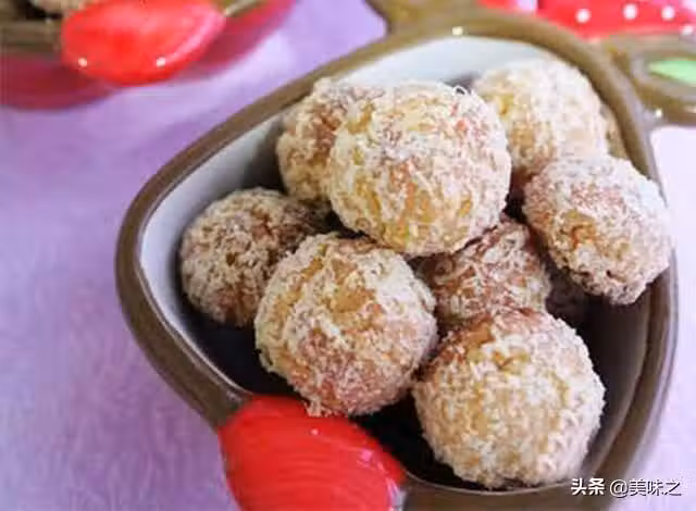 5、將圓球在椰蓉里滾一下,讓圓球沾滿椰蓉。