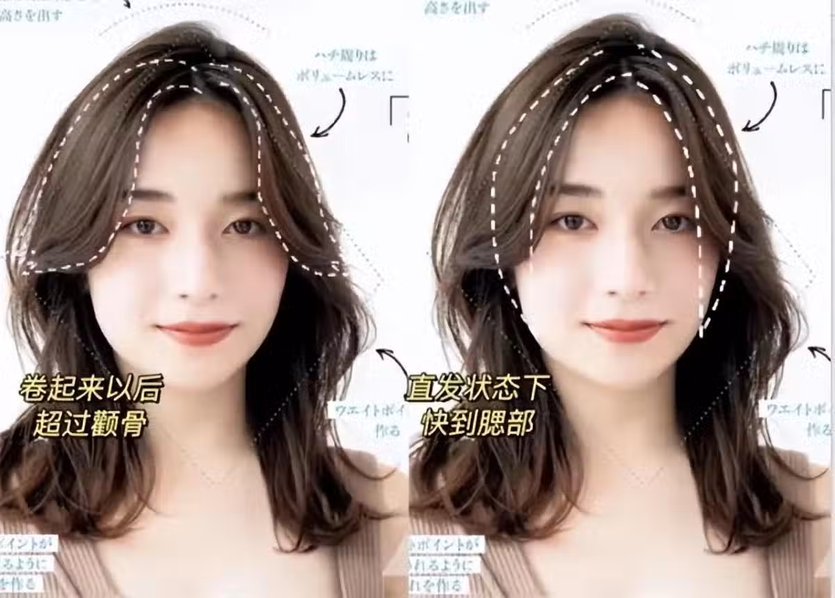 弧度比較大的鎖骨髮,劉海就不要太死板了,建議大家可以將劉海捲起來,長度要超過顴骨位置,劉海的髪尾要和後面的頭髮銜接起來,這樣才能夠讓整個髮型看上去更自然。