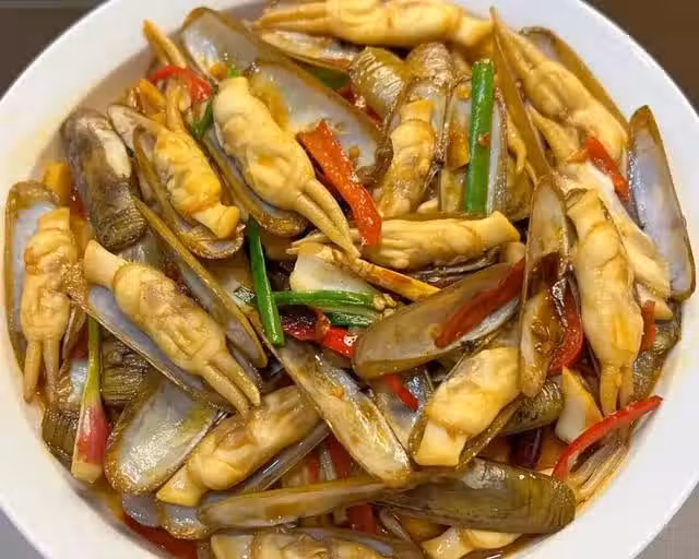 (4)再放入蟶子翻炒至斷生,加入適量的老抽、生抽、雞精、白砂糖、蚝油調味。