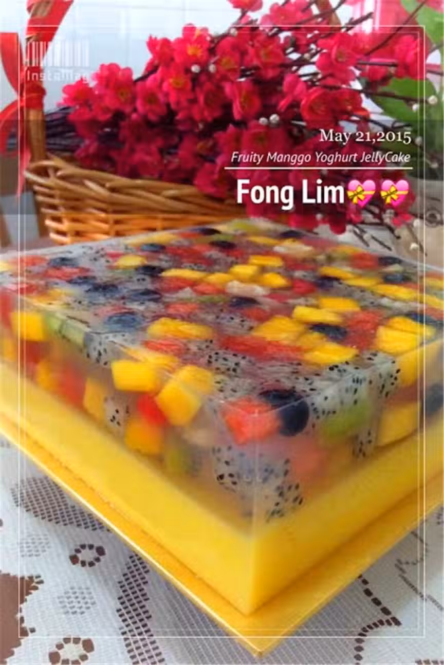 2)將(B)材料,放進鍋里,攪拌均勻,煮滾,先將1/3 燕菜汁,倒在芒果層上,分兩次鋪上切丁水果,交叉將燕菜汁倒完。