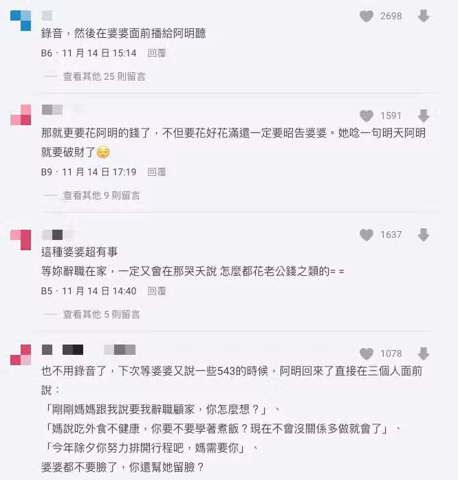 原PO直言,婆婆都是挑老公不在的時候口出惡言,還擔心自己花到老公的錢,讓她直呼,「應付婆婆比上班還要累」。文章曝光後,網友也紛紛為她打抱不平,「等妳辭職在家,一定又會在那說:怎麼都花老公錢」、「跟她說生小孩之後要辭職也是你老公,因為賺的沒妳多」、「還好沒住一起!過年當媳婦的真的很可憐」、「這種婆婆真的超有事」。