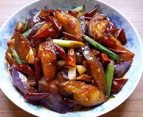 2.加熱鍋中的油,加入榨好的茄子,然後炸茄子使其變軟並除去油。將少量的基礎油留在原鍋中,再炒蔥和姜,倒入青椒和紅辣椒,然後均勻地攪拌,倒入炸茄子,倒入準備好的醬汁中,然後均勻地攪拌,倒入少許麻油。 ,然後在均勻炒菜時撒上香菜。