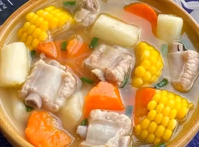 4.出鍋前兩分鐘撒上食鹽,最後撒上小蔥花,一鍋熱騰騰的山藥玉米胡蘿蔔排骨湯就做好了,這款湯清甜一點也不油膩,顏色靚麗,營養豐富。