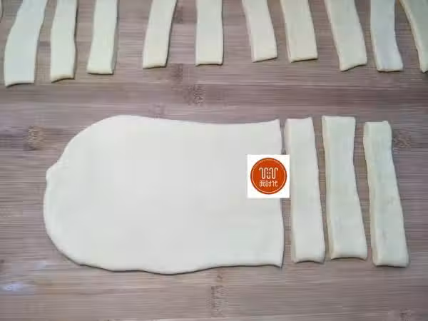 8、 40分鐘後鍋中倒入菜油,中火加熱,油7成熱時,取兩塊面片疊加用筷子壓一下,兩手捏制兩頭。