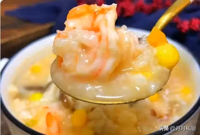 4.取一個湯鍋,倒入一小碗熟米飯加入適量的清水,水開後煮三分鐘,再倒入炒好的肉末、腌制好的蝦、蝦油、胡蘿蔔、香菇和玉米粒,煮至湯汁變濃稠後,加少許的食鹽調味,最後撒入小蔥花即可。