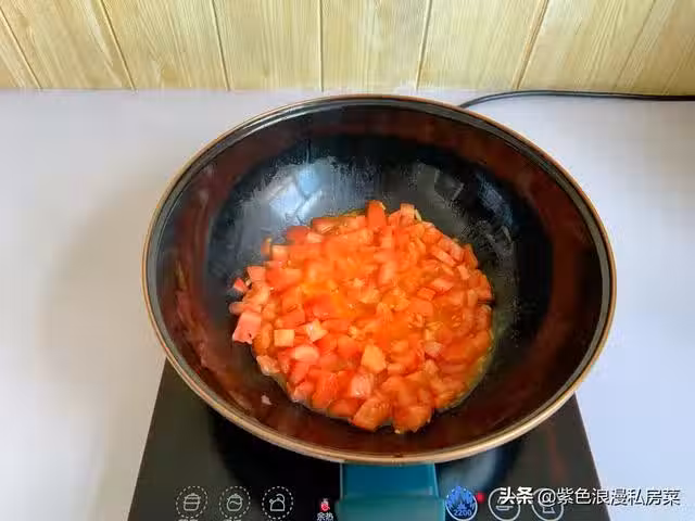 2.鍋中放少許橄欖油,放蔥花爆香,放番茄炒出番茄汁。
