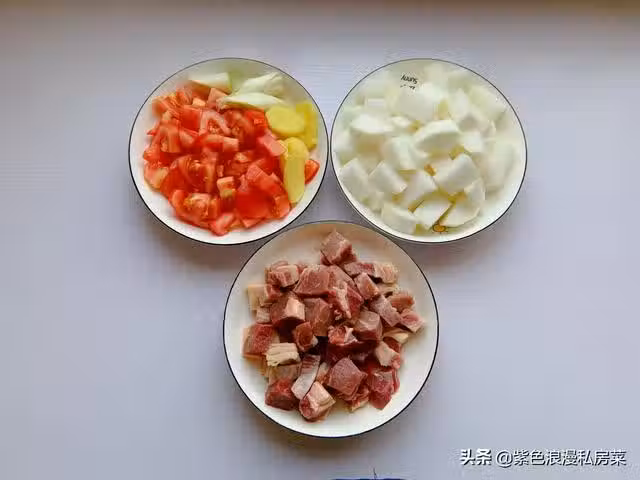 1.準備所有的食材,牛肉我用的牛排,更容易燉軟爛,也可以選用牛腩,牛肉和蘿蔔切小塊,番茄去皮切塊,生薑切片。