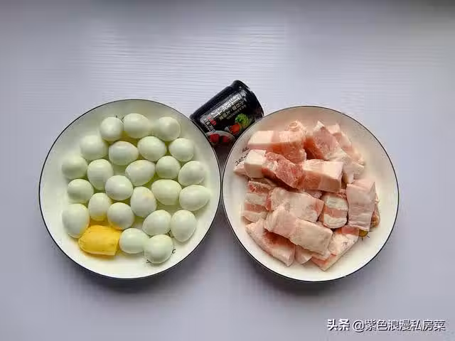 1.準備食材,五花肉切塊,鵪鶉蛋煮熟後放冷水中浸泡,再將鵪鶉蛋去殼。