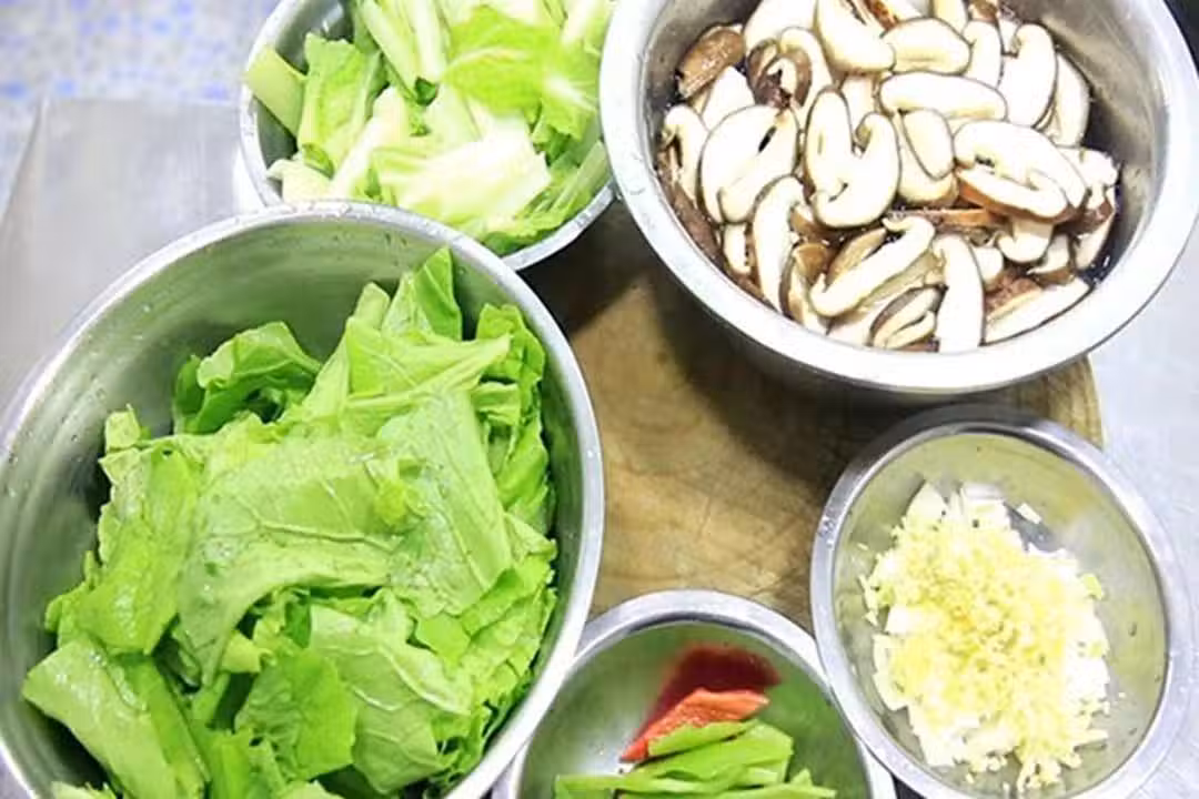 1.香菇幾朵,去掉香菇根,切成片,用淡鹽水浸泡洗乾淨;;小白菜打散,洗凈泥沙後切成段;青紅椒切成菱形片,用來搭配顏色;另外切點蔥花、薑末、蒜末備用。