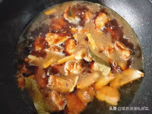 7.倒入沒過食材的開水,再放幾滴陳醋或者香醋,放醋可以使排骨快速燒軟爛,也可以將排骨中的鈣質分解出來,大火燒開後轉小火燉30分鐘。