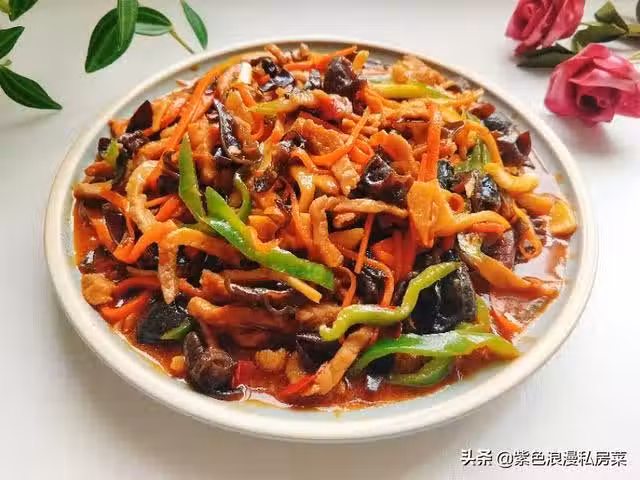 5.放木耳,冬筍,胡蘿蔔翻炒,淋入魚香汁,翻炒均勻,放青椒翻炒,放雞精,撒上蔥段即可出鍋。