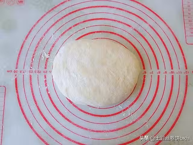 9、蓋上另一半麵皮,簡單擀幾下,現在麵餅的總體厚度不到一厘米的厚度。
