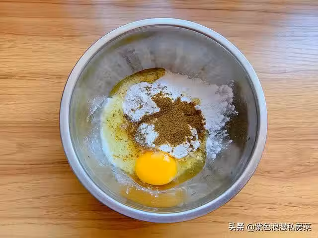3.準備麵糊,碗中放一勺麵粉,一勺玉米澱粉,即麵粉和玉米澱粉的比例是1:1,再放適量的鹽,一勺五香粉增香,適量的胡椒粉 打入一個雞蛋。