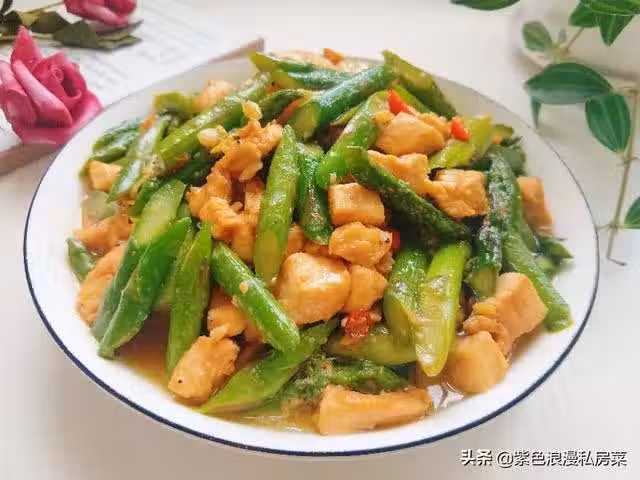4.鍋中放油,放生薑,大蒜,小米椒爆香,放雞丁翻炒斷生,放入蘆筍,放適量的鹽,放一勺蚝油,放胡椒粉雞精,翻炒均勻即可出鍋。